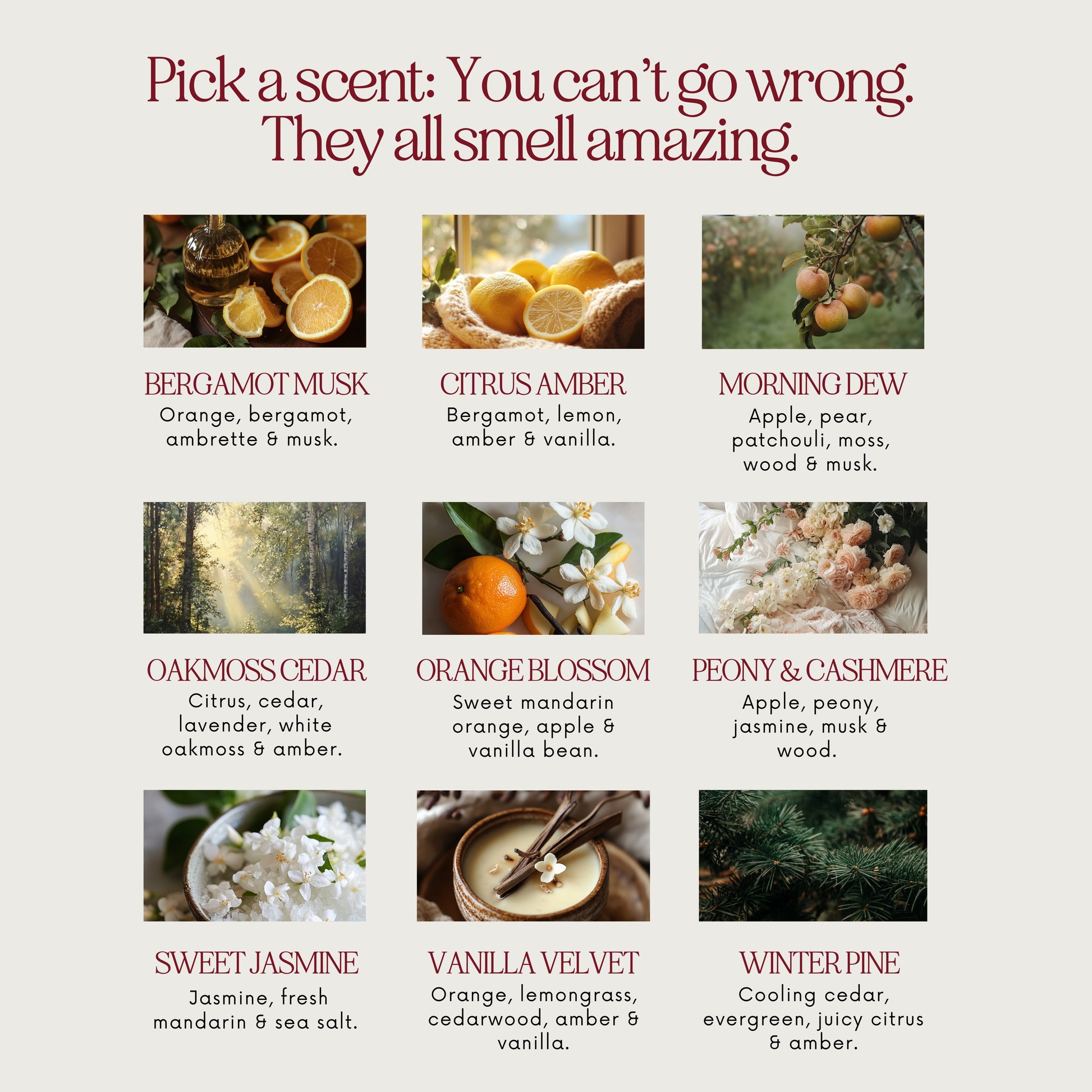 VANILLA VELVET: Orange, lemongrass, cedarwood, amber & vanilla.