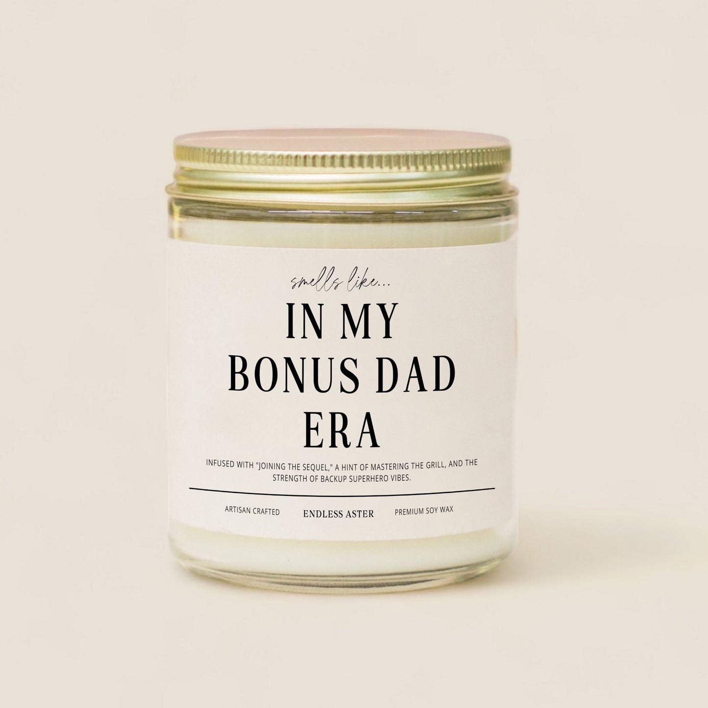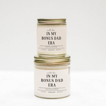 A candle for the amazing bonus dads. Our 'In My Bonus Dad Era' candle is a big shoutout to the love and warmth of finding family in unexpected places. Infused with 'joining the sequel,' a hint of mastering the grill, and the strength of backup superhero vibes, it's a unique gift for that special bonus dad in your life.
