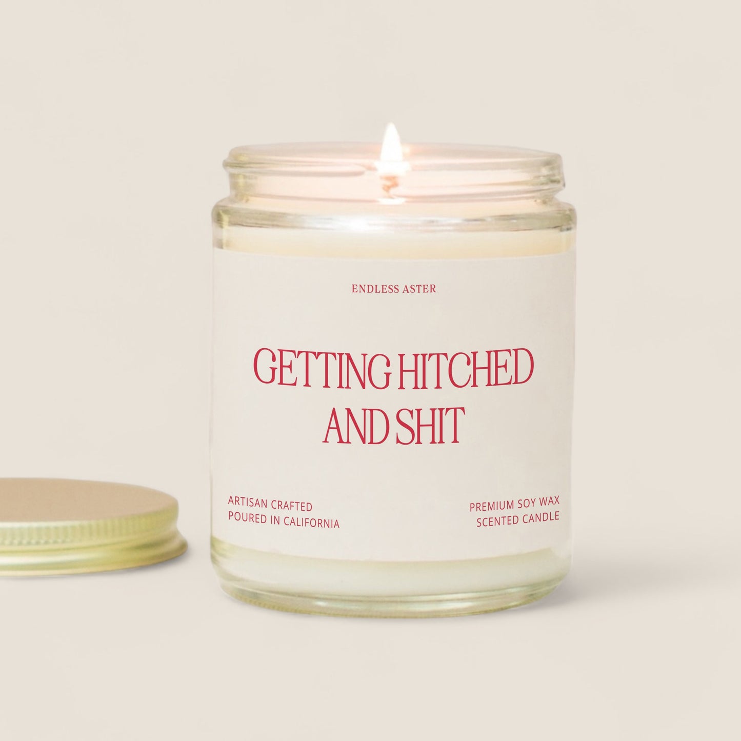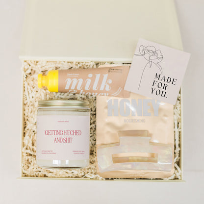 A candle for celebrating the journey to "I do." Our "Getting Hitched and Shit" candle is perfect for marking the fun and excitement of wedding planning with a touch of humor and love.