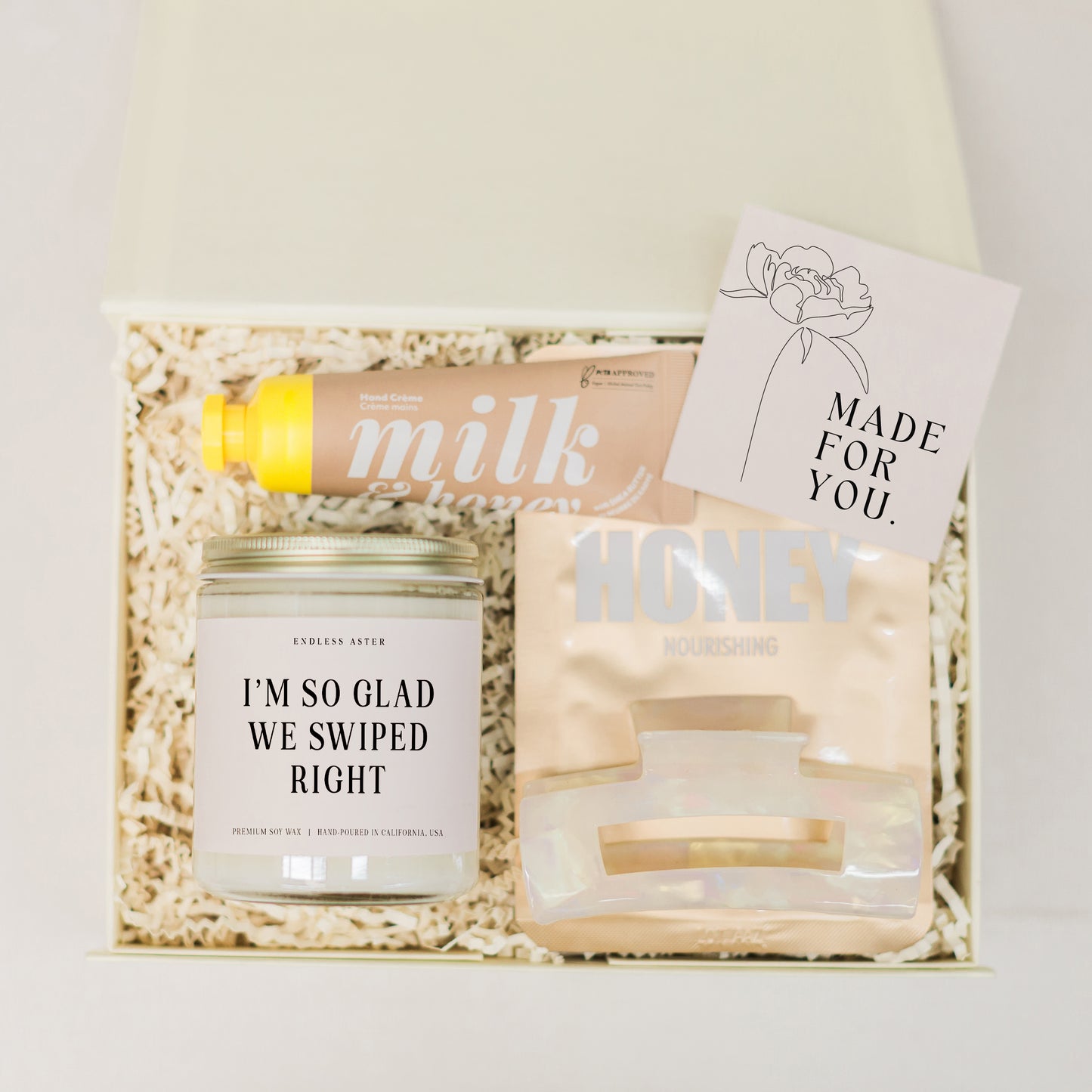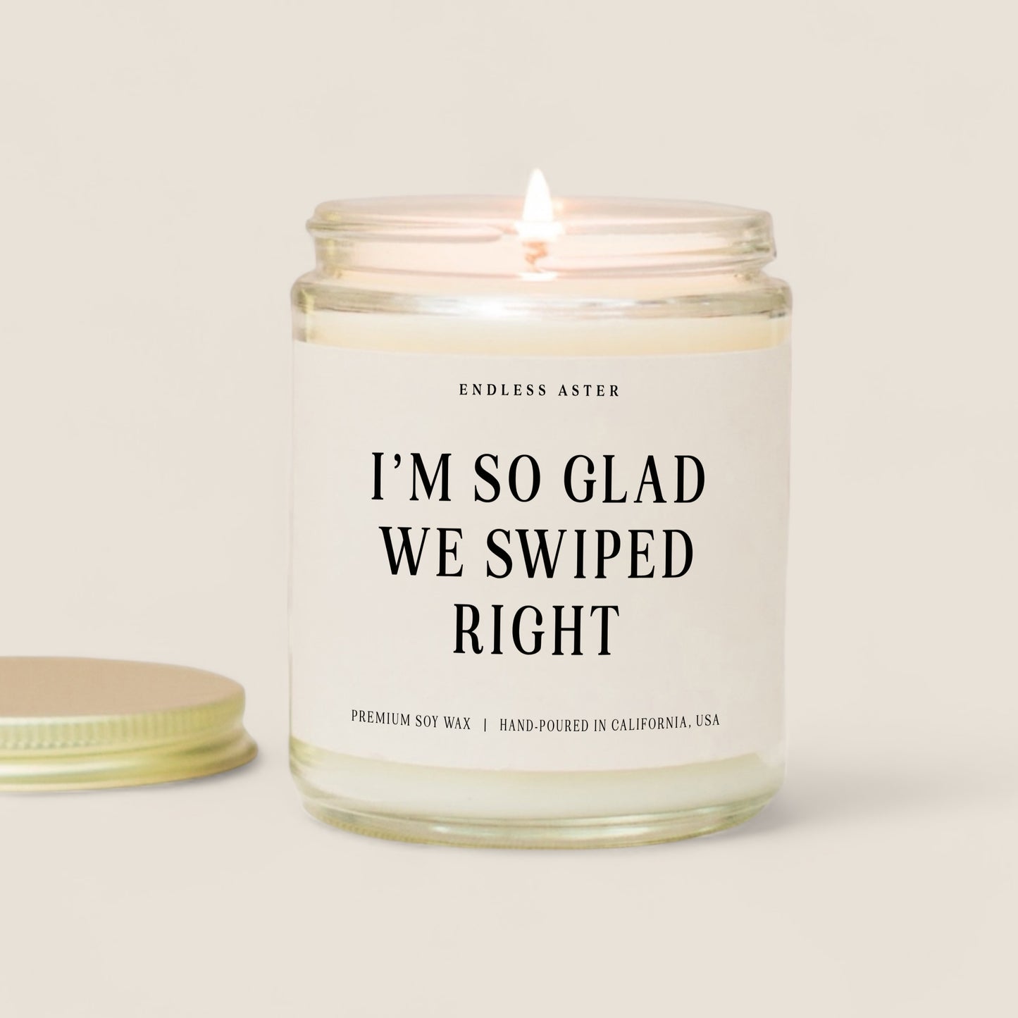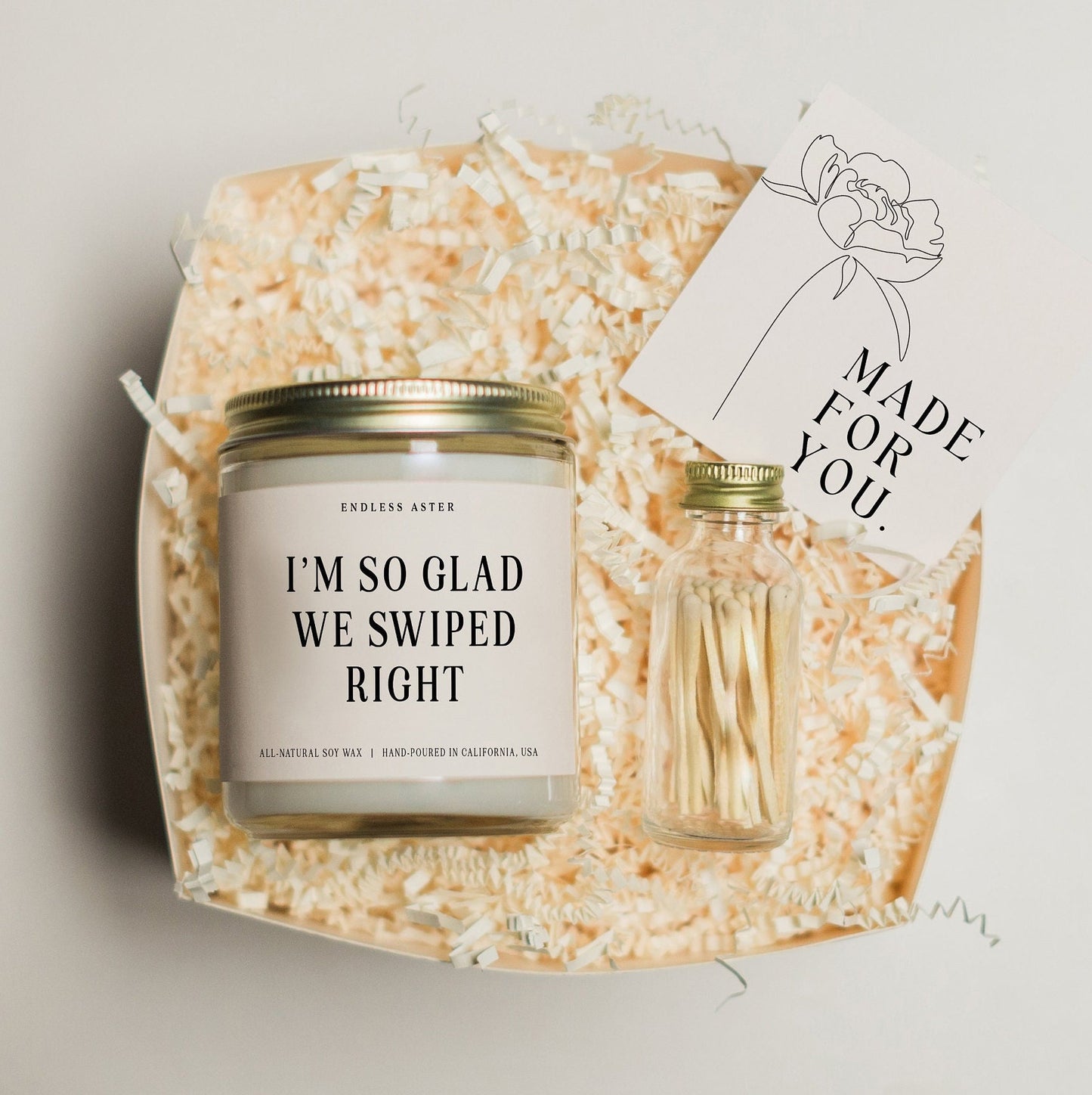 If you're looking for a gift that's sure to get a laugh, look no further than this candle. This funny candle is the perfect gift for the partner who has everything. Whether it's a birthday gift, anniversary gift, Christmas gift or simply to add some joy to everyday life, this 'I'M SO GLAD WE SWIPED RIGHT' candle is sure to bring a smile to her face. Add safety matches and a delicious chocolate bar or a cozy tea set for an extra special touch.