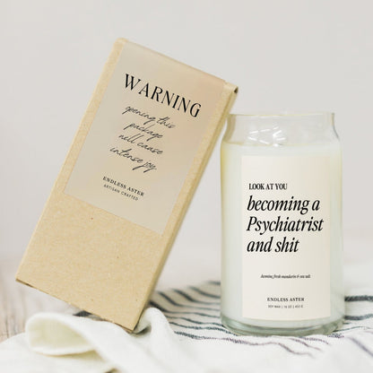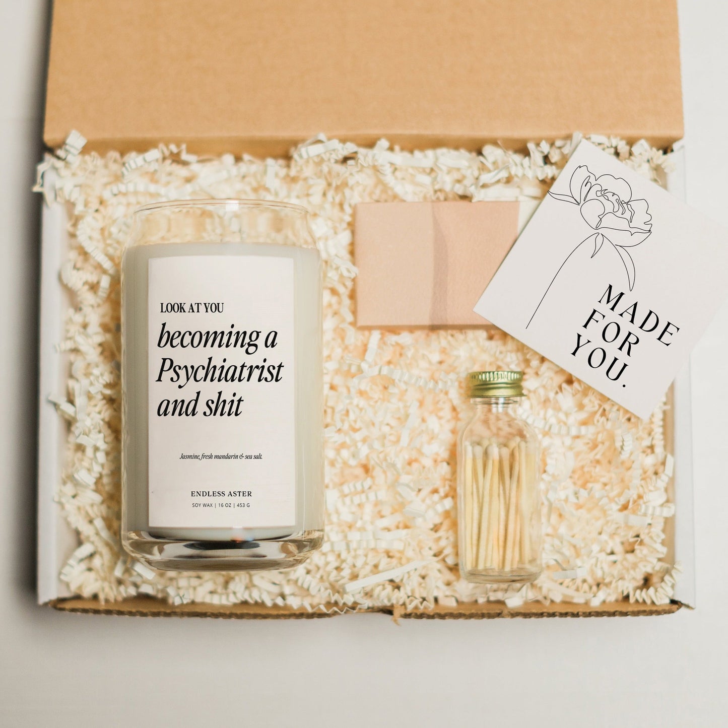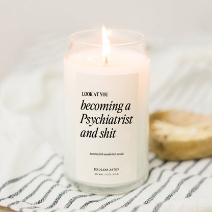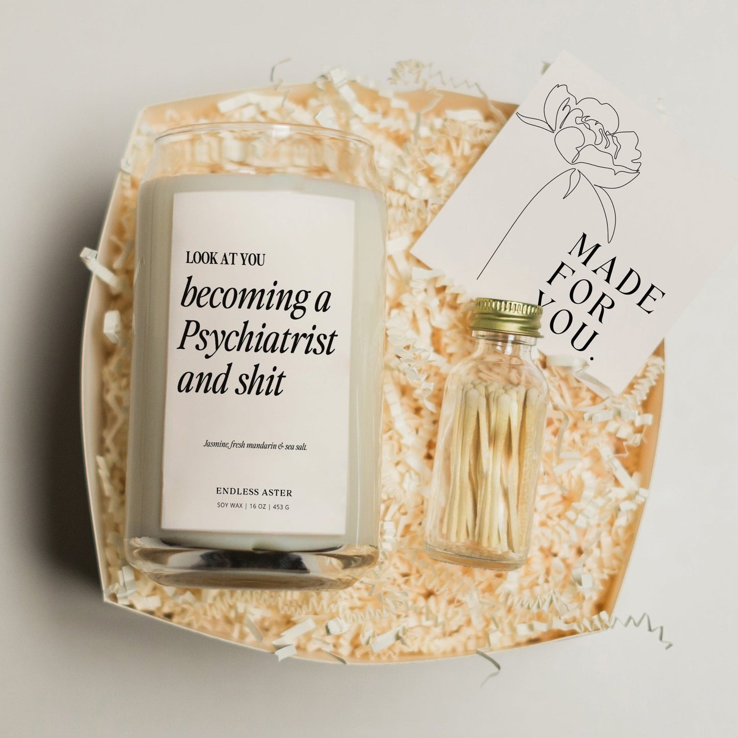 What better way to show someone how proud you are of their accomplishments than with a candle that celebrates their new status in life? This "LOOK AT YOU BECOMING A PSYCHIATRIST AND SHIT" candle is the perfect gift for any soon-to-be psychiatrist in your life. Featuring a fun modern design & delightful scent, this candle is sure to bring a smile to their face. So whether you're looking for a unique graduation gift or just want to show someone how much you support their dreams, this candle is the perfect way to do it. Add safety matches and a delicious chocolate bar for an extra special touch.