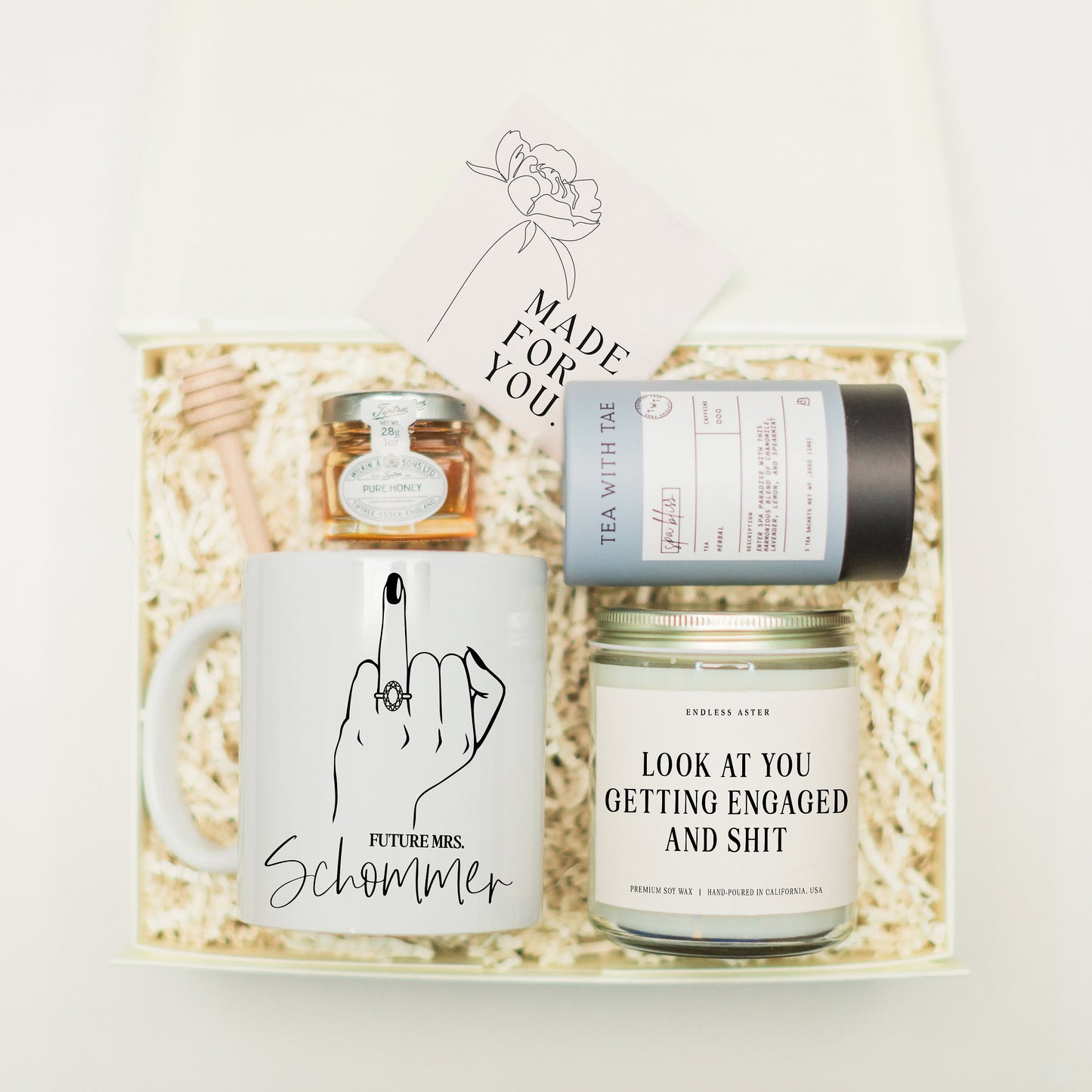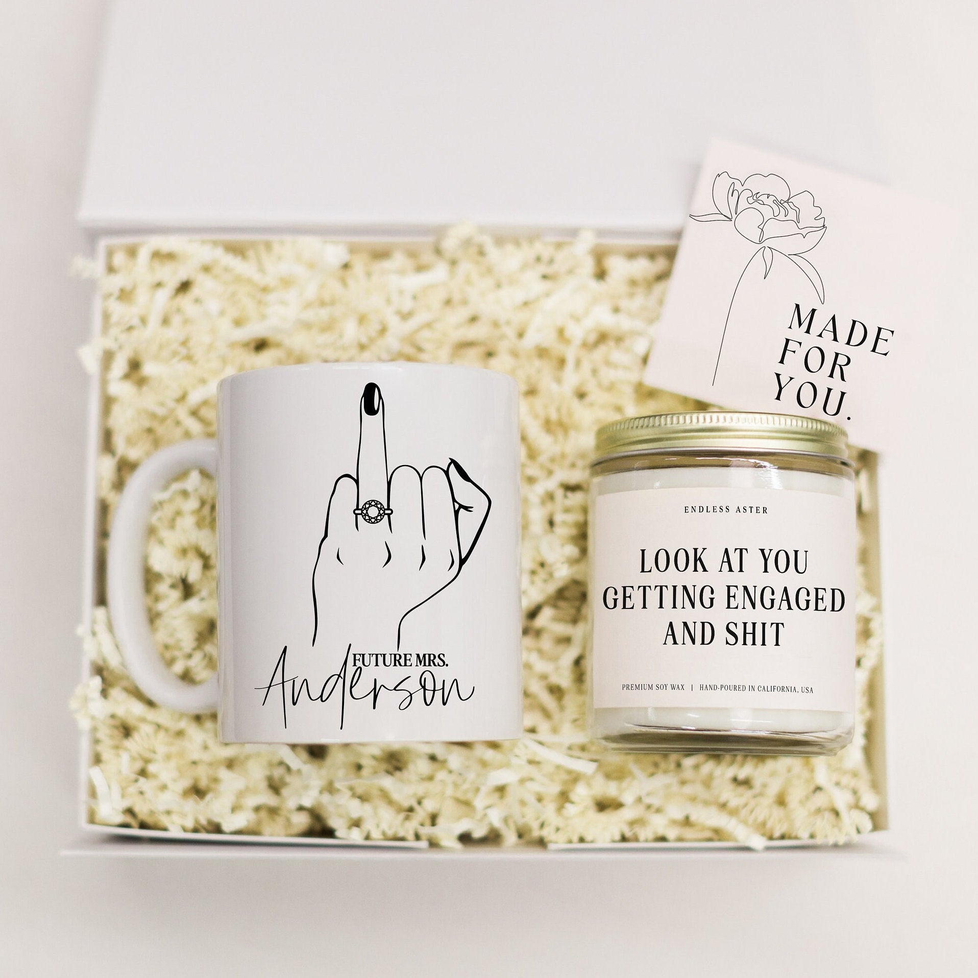 Inside, you'll find a super cute ceramic mug ready to rock her future last name and ring style. Plus, there’s our best-selling "LOOK AT YOU GETTING ENGAGED AND SHIT" candle – think zesty citrus vibes, fresh lemon, dreamy white blossom, and crisp greens. It’s a whole mood!