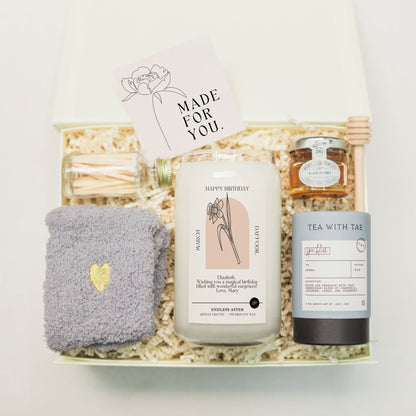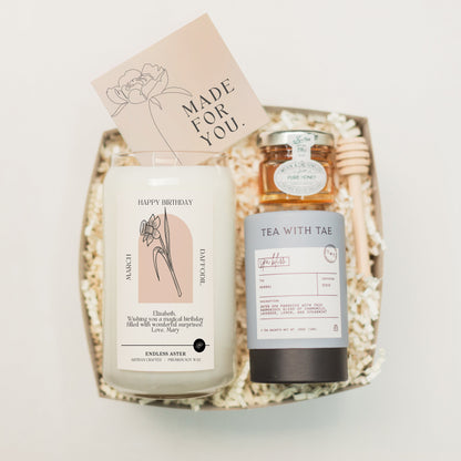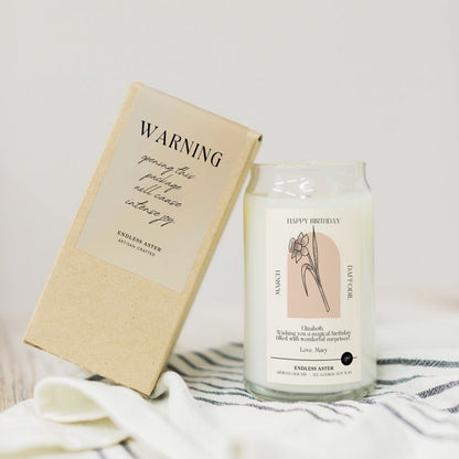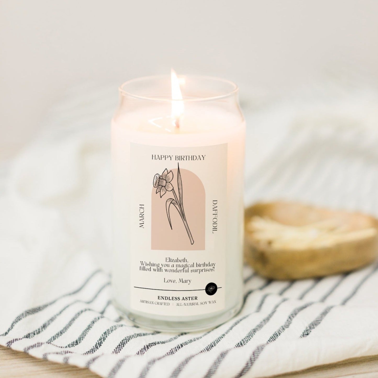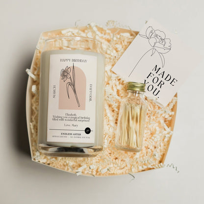 Send the most thoughtful birthday gift to your loved one with this personalized candle featuring her birth flower and a custom message. Sure to put a smile on her face, this candle is perfect for the women who has everything! Add matches and a delicious chocolate bar or a cozy tea set for an extra special touch.