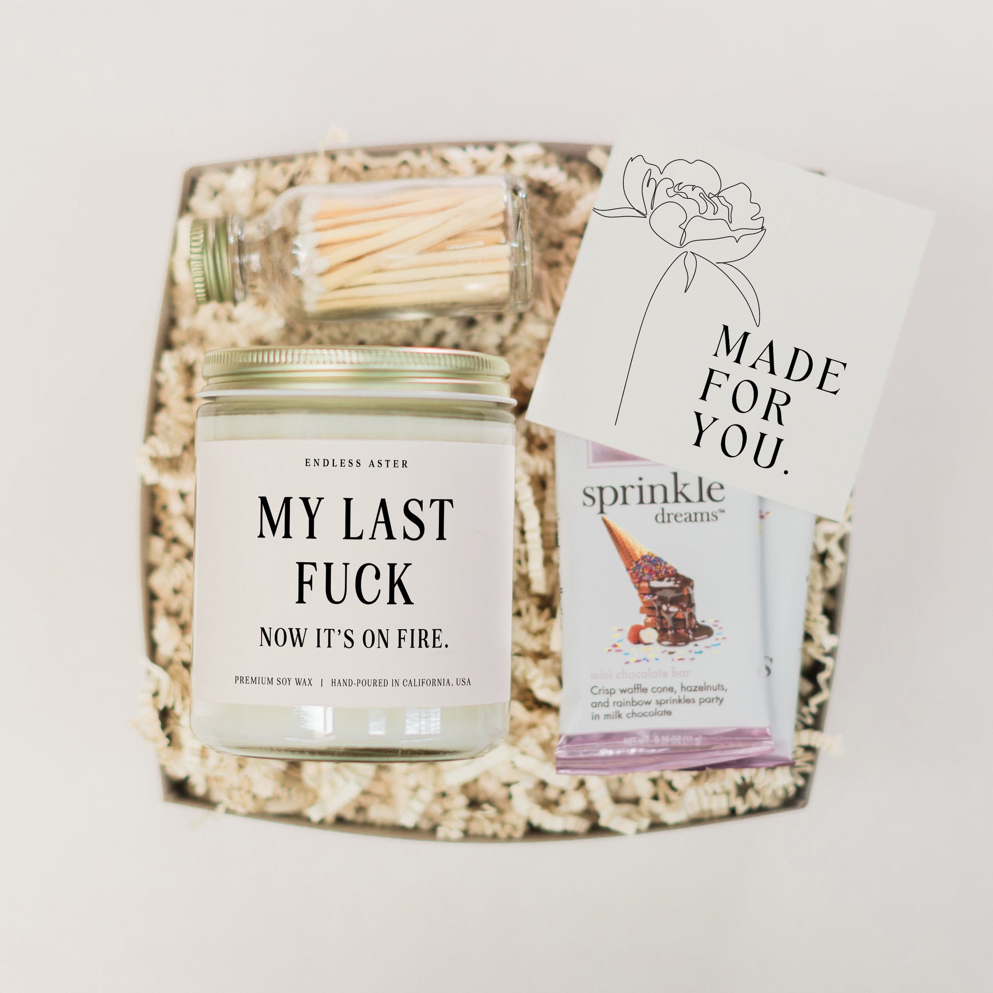 If you're looking for a gift that's sure to get a laugh, look no further than this candle. This funny candle is the perfect gift for the person who has everything. Whether it's a birthday gift or simply to add some fun to everyday life, this 'MY LAST FUCK NOW IT'S ON FIRE' candle is sure to bring a smile to her face. Add safety matches and a delicious chocolate bar or a cozy tea set for an extra special touch.