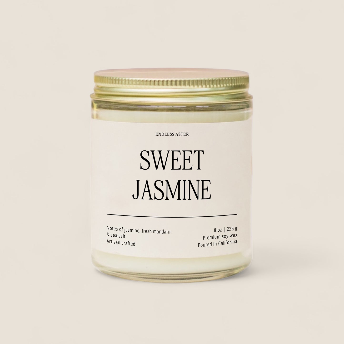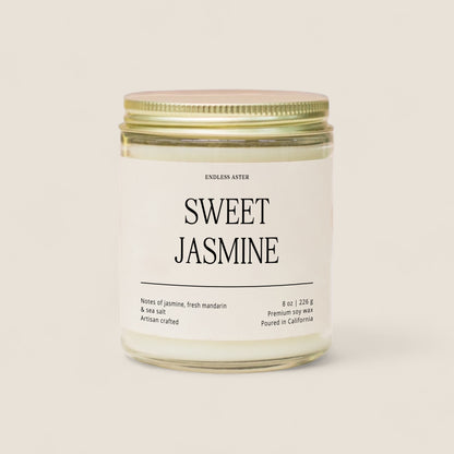 Light up our Sweet Jasmine candle and enjoy the delightful mix of jasmine, fresh mandarin, and sea salt. Made with premium soy wax and an eco-friendly cotton wick, this candle burns clean and bright every time. The sweet jasmine brings a floral touch, while the fresh mandarin and sea salt add a refreshing and invigorating twist.