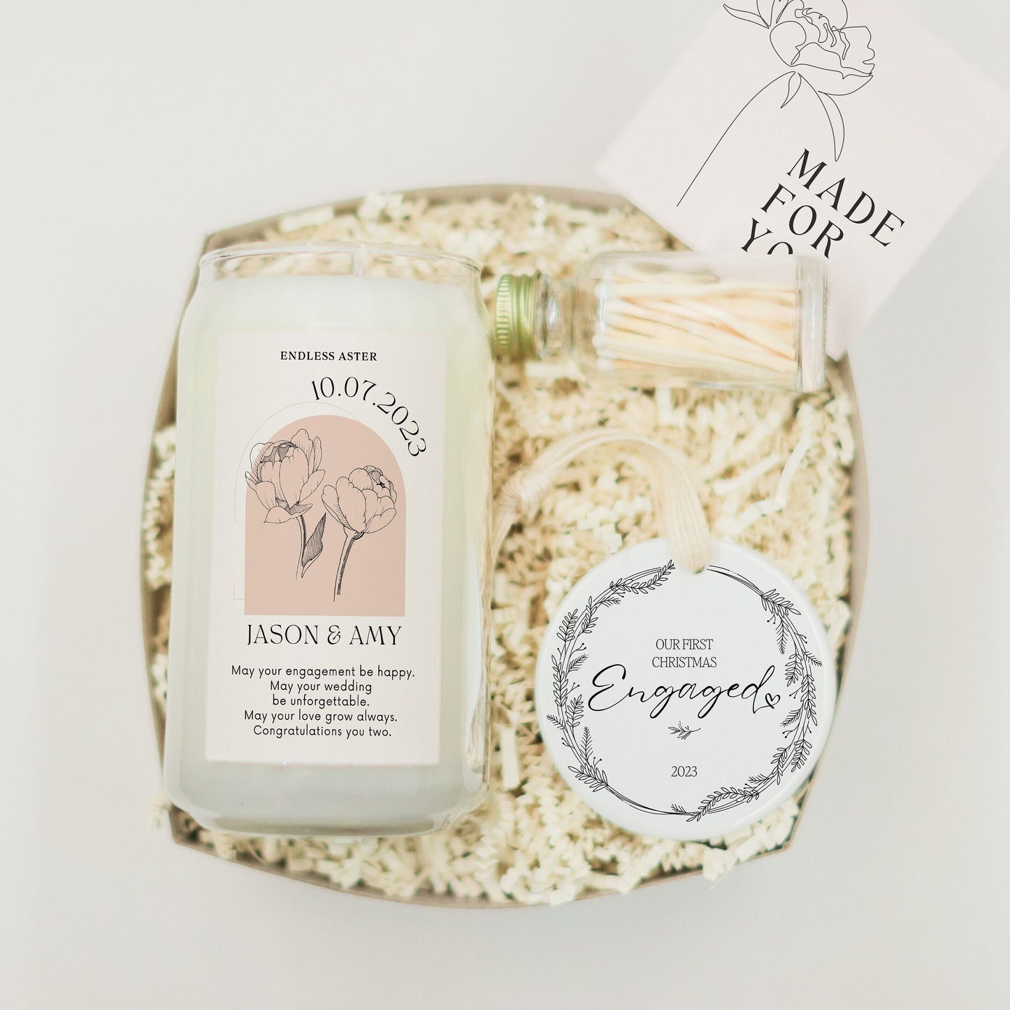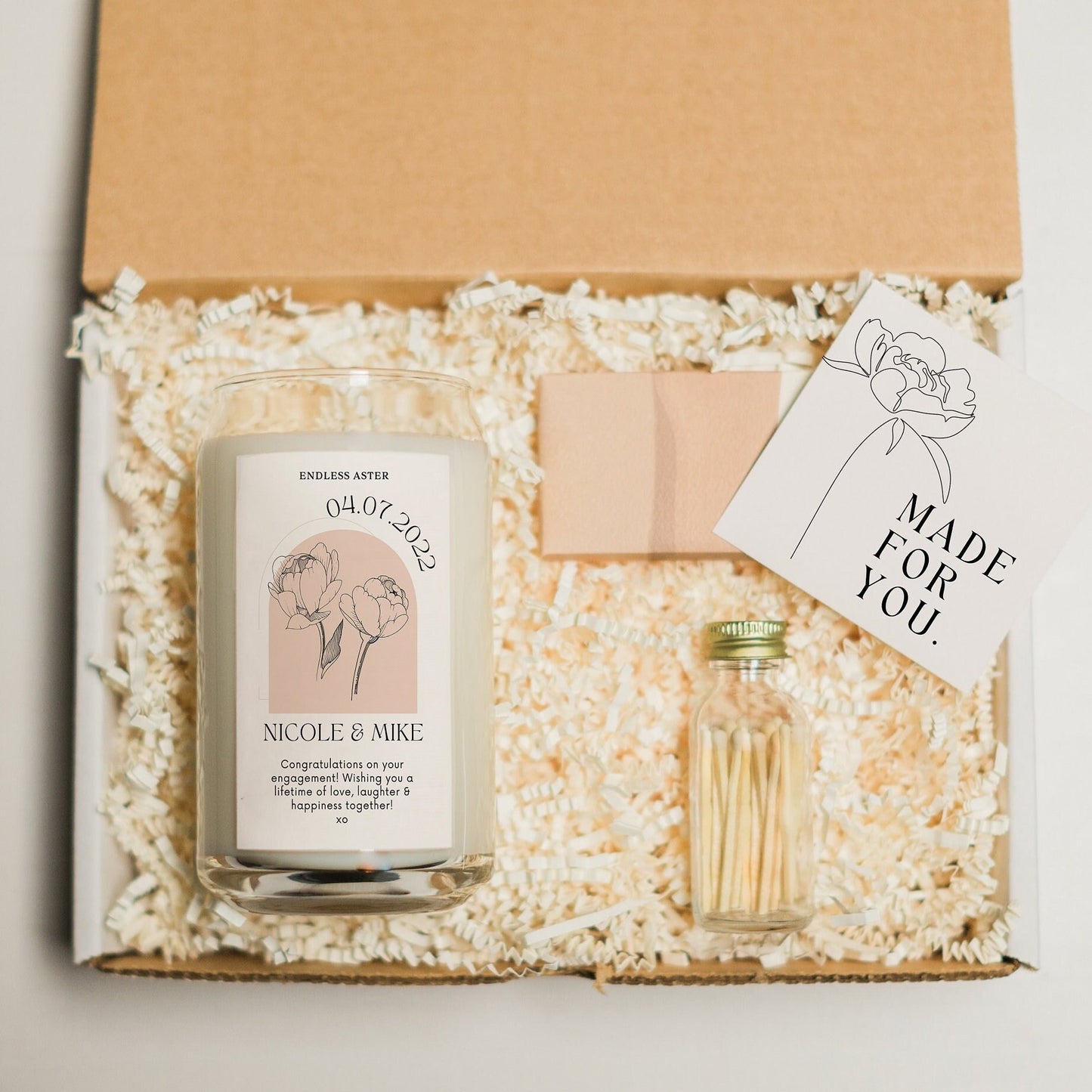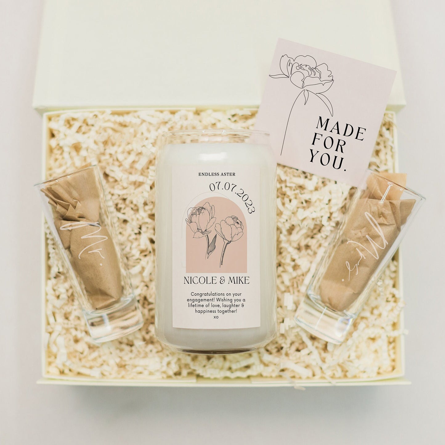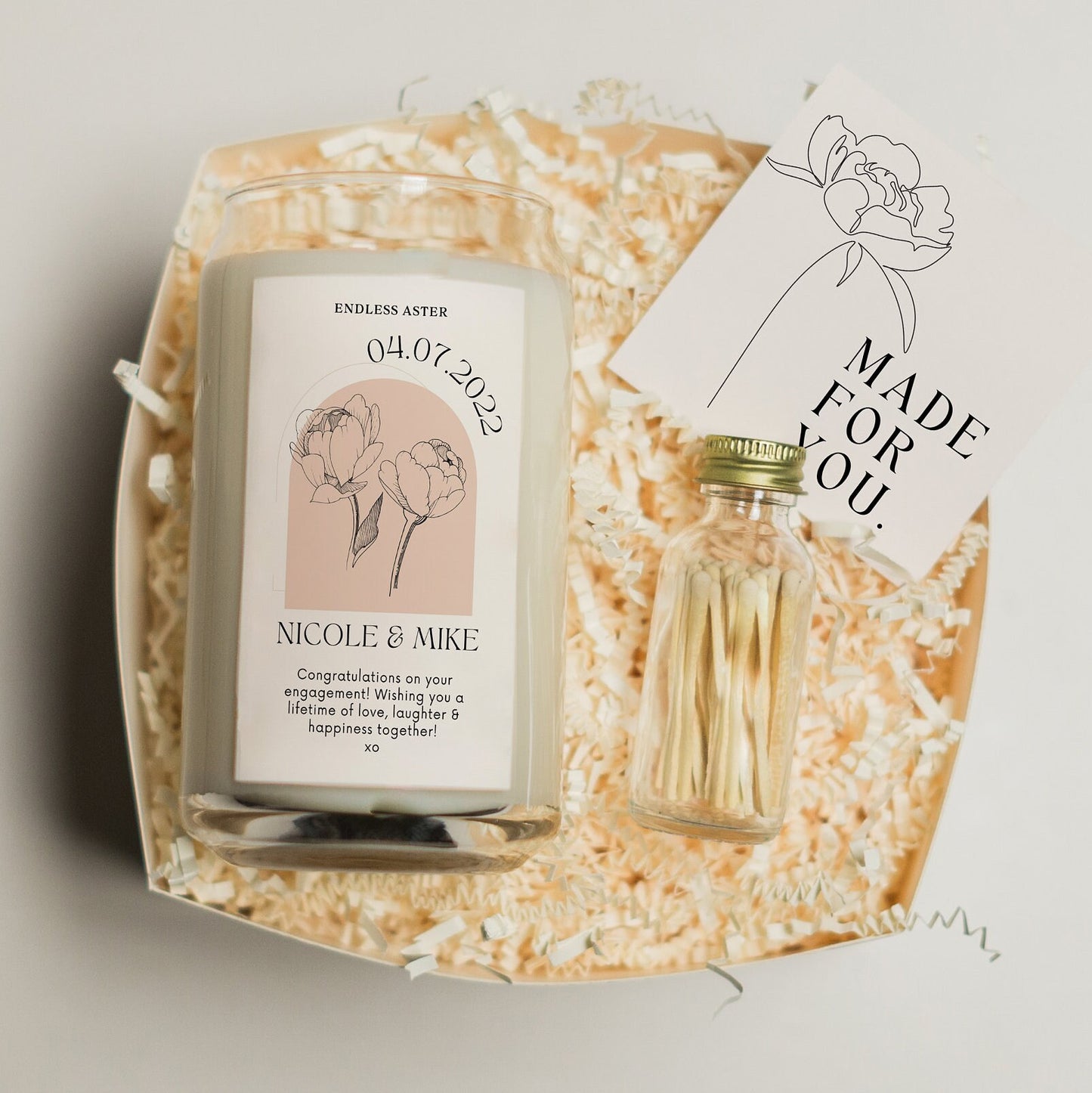 Send the most thoughtful gift to your favorite couple with this personalized candle featuring their names, engagement date, and a sweet message from you. Sure to put a smile on their faces, this candle is perfect for the couple who has everything. Add safety matches, a delicious chocolate bar, a cozy tea set, champagne flutes or shot glasses for an extra special touch.