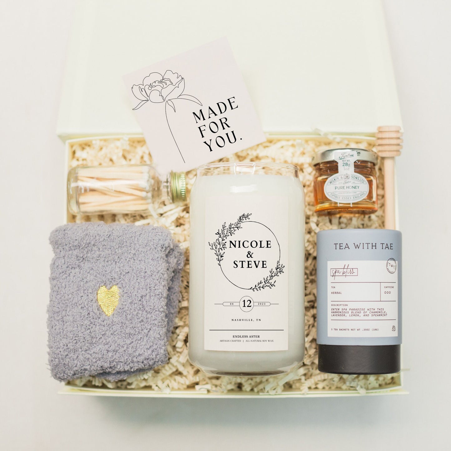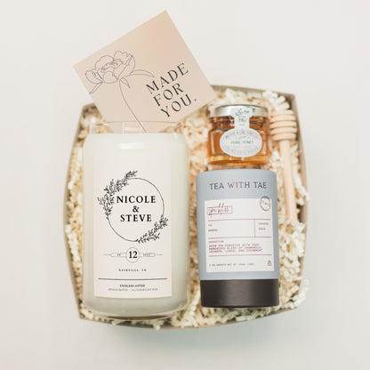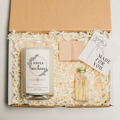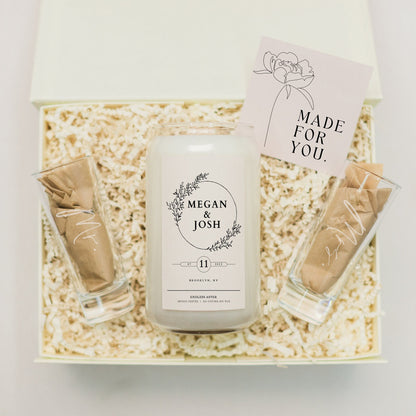Send the most thoughtful gift to your favorite couple with this personalized candle featuring their names, engagement date and location. Sure to put a smile on their faces, this candle is perfect for the couple who has everything. Add safety matches, a delicious chocolate bar, a cozy tea set, champagne flutes or shot glasses for an extra special touch.
